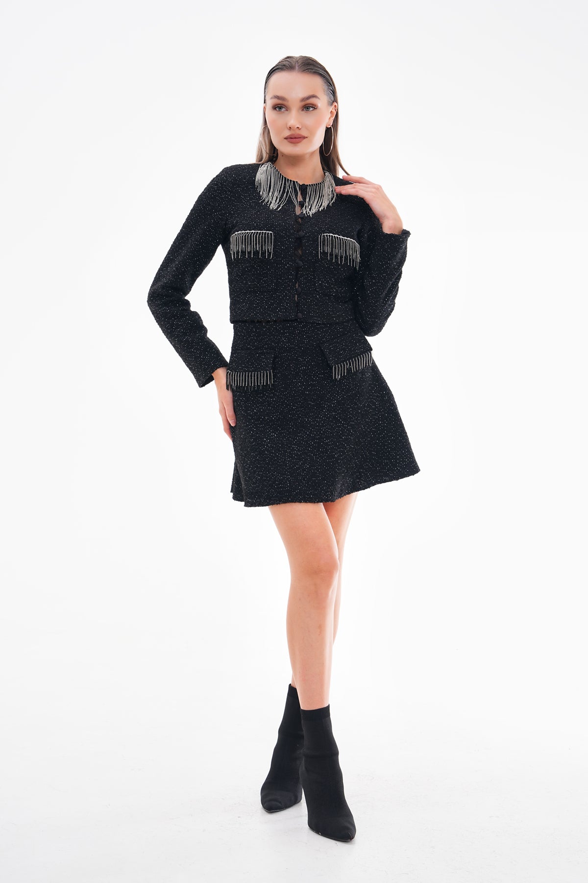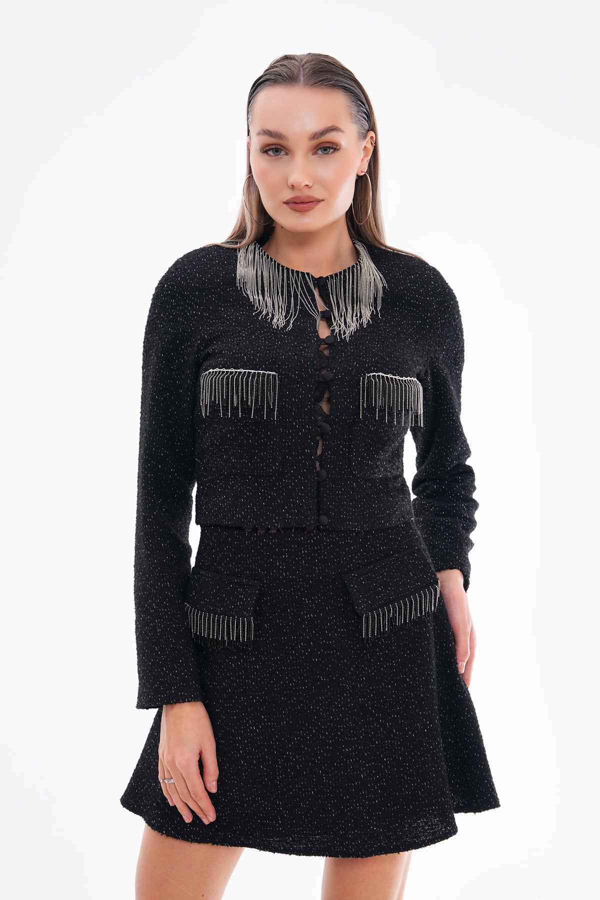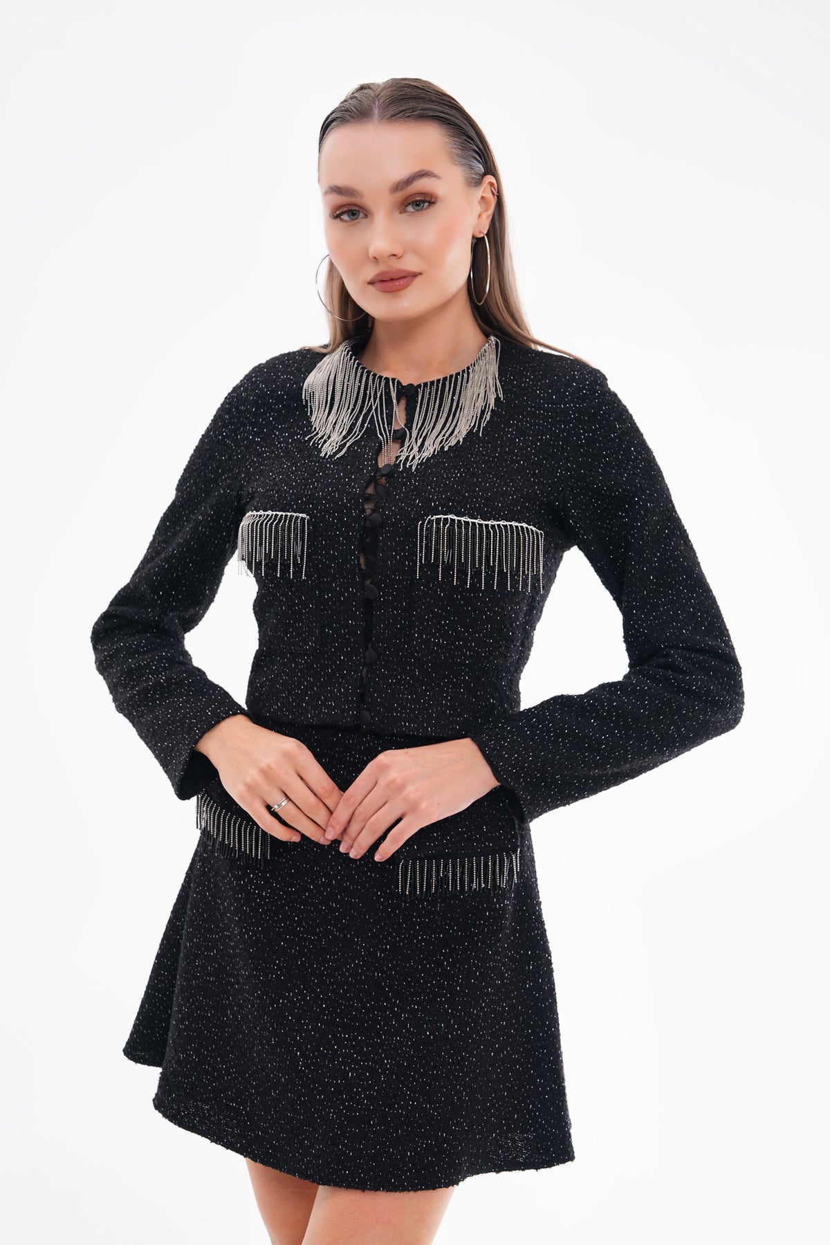 This special suit, which brings together extraordinary design and elegance, is the perfect option to attract attention at any event! The skirt, jacket and shorts combination, enriched with black chain tassel details, offers both an elegant and modern look.