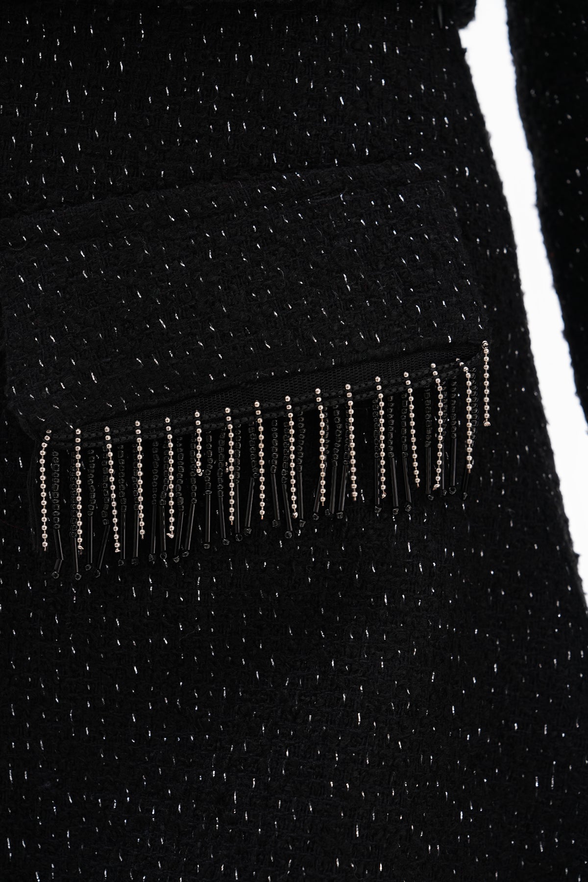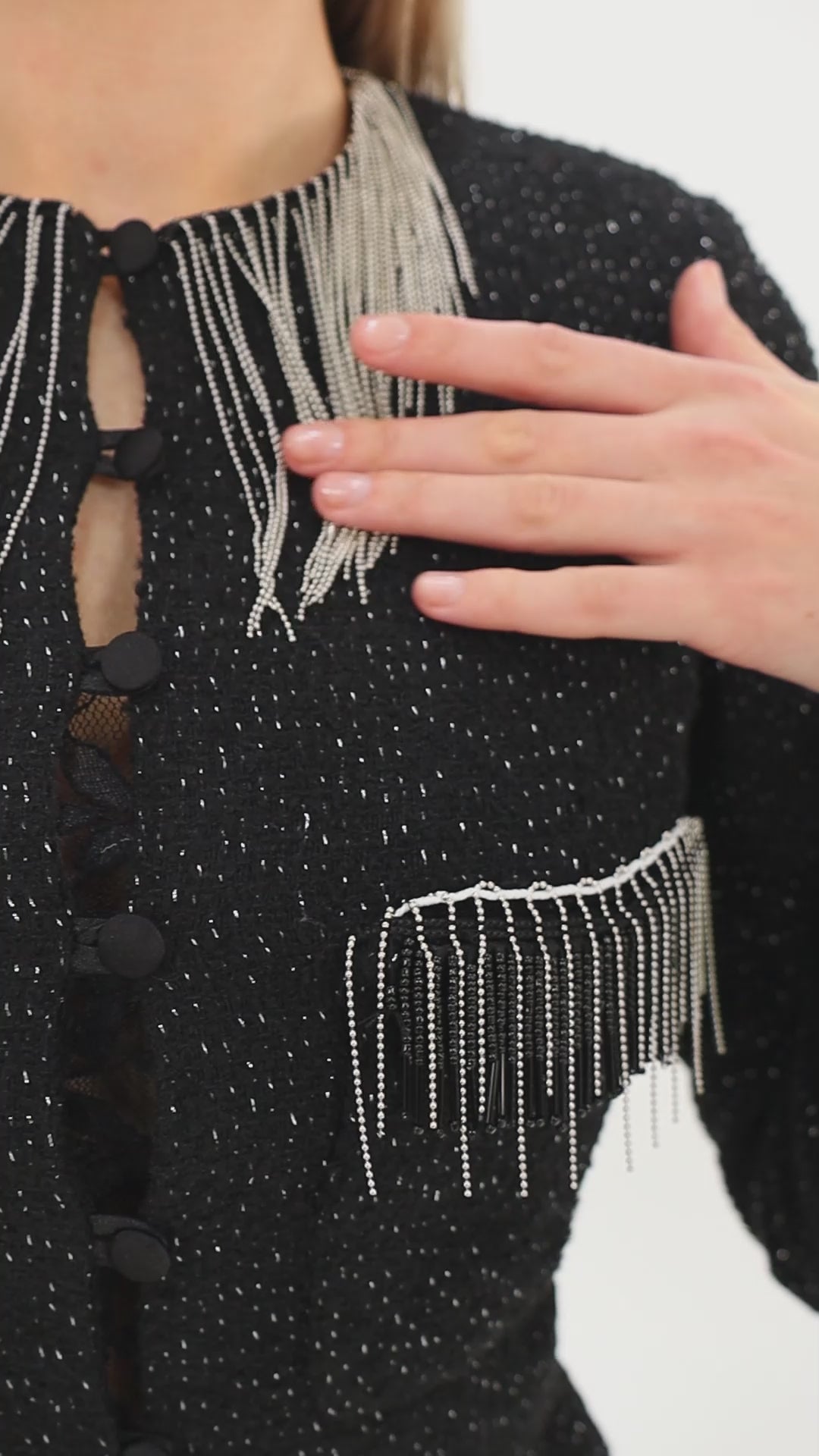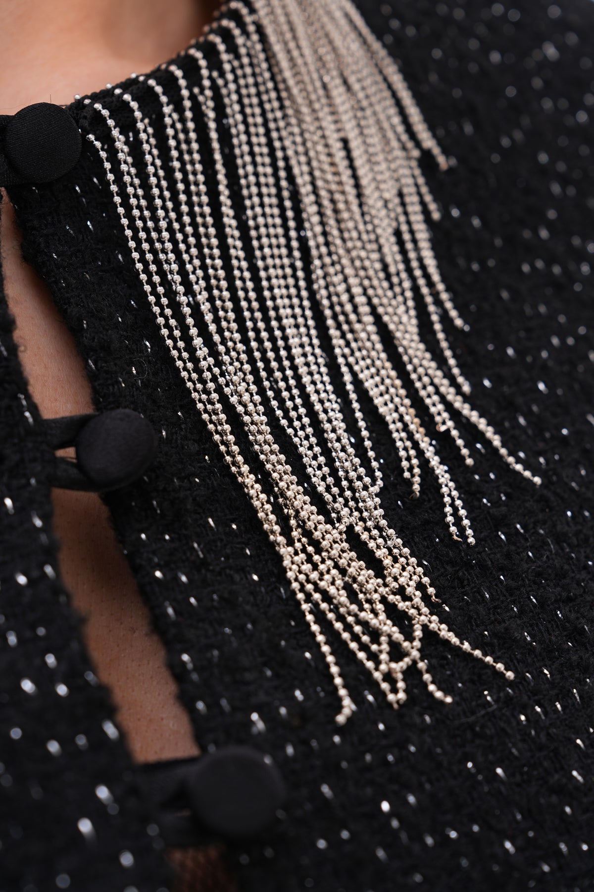 This special suit, which brings together extraordinary design and elegance, is the perfect option to attract attention at any event! The skirt, jacket and shorts combination, enriched with black chain tassel details, offers both an elegant and modern look.