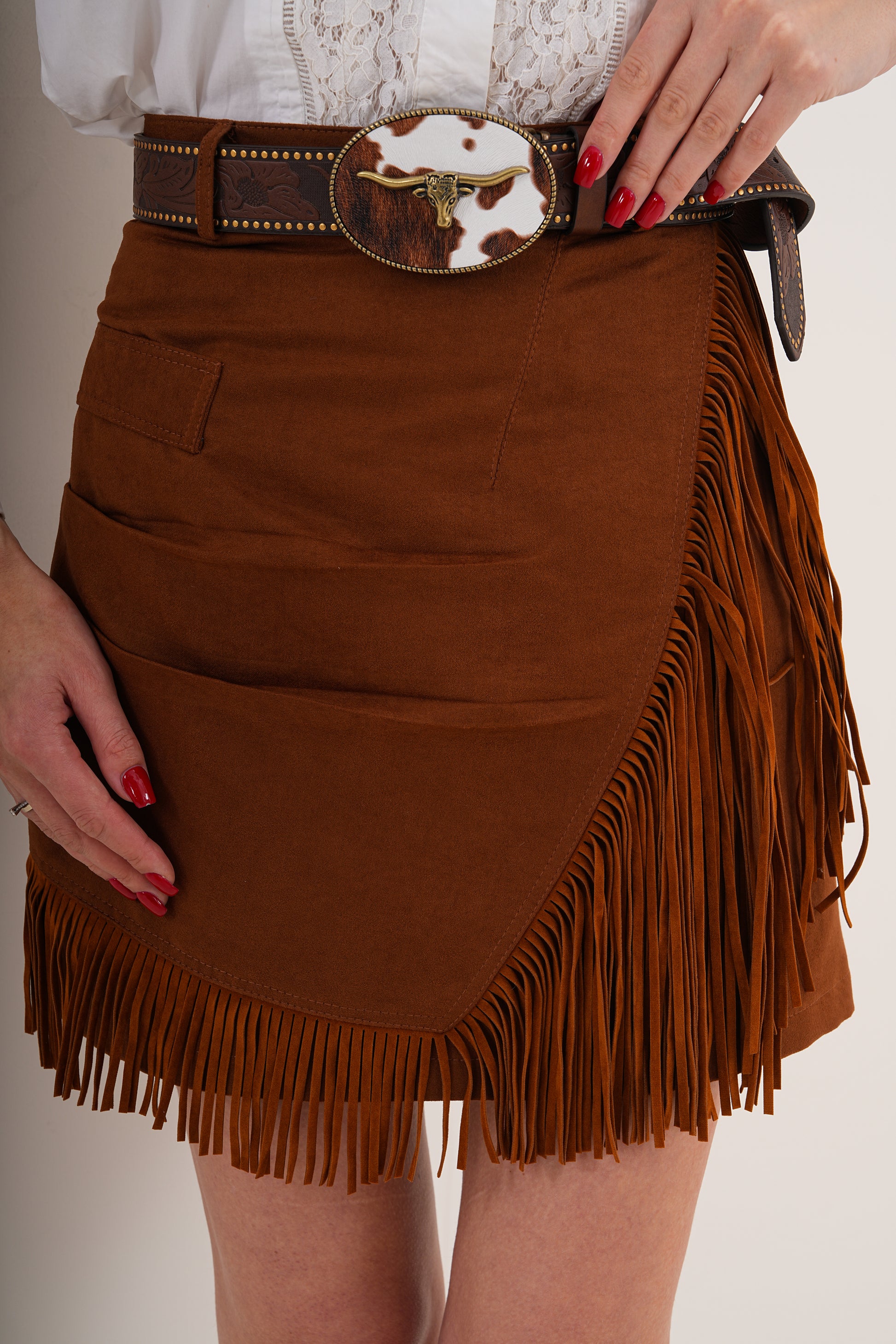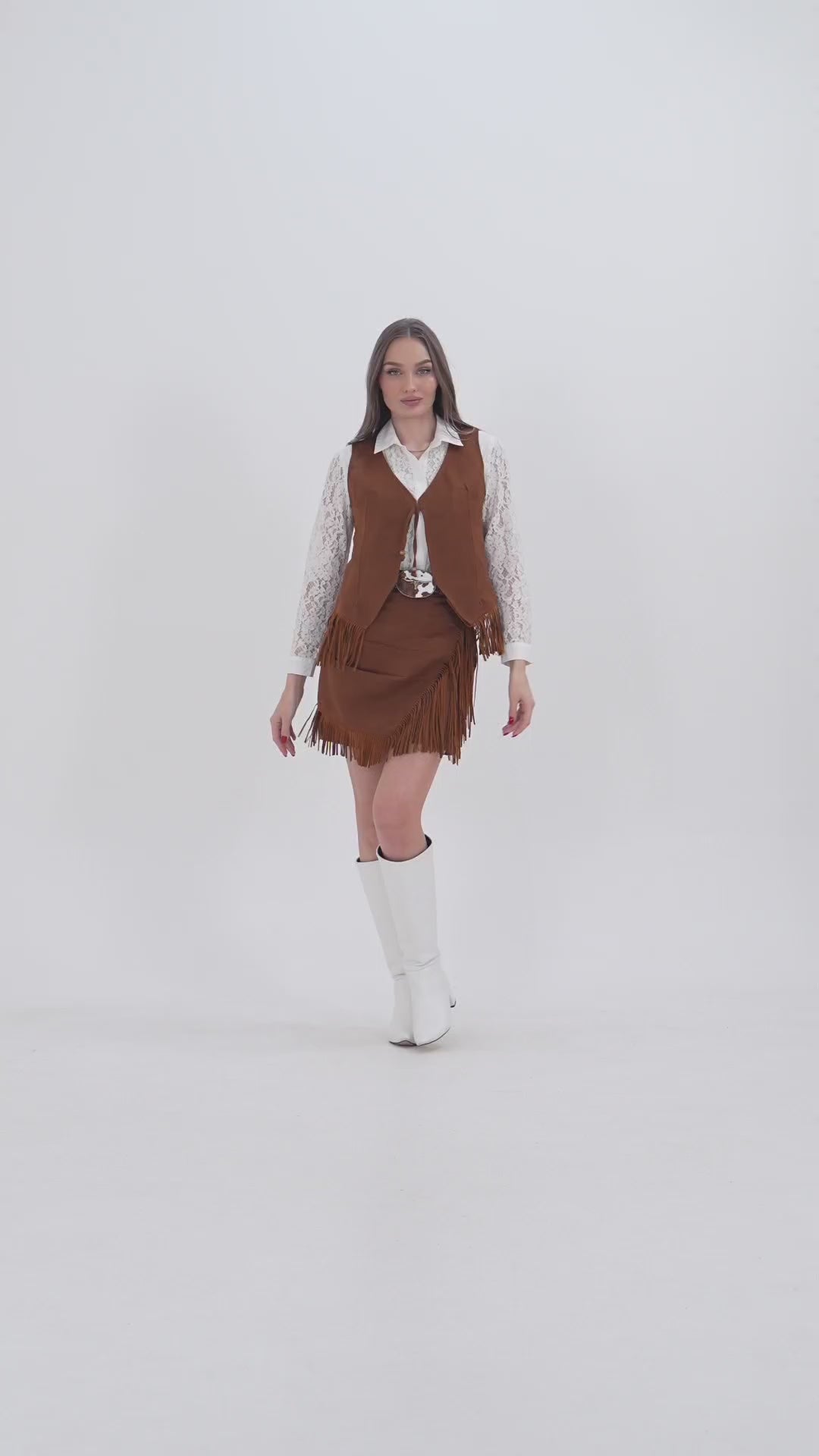 Şort etek; hem konforlu hem iddialı bir duruş sunarken, püsküllü yelek kombinine karakter kazandırır. Gün içinde çizme veya sneaker ile enerjik bir şehir stili yaratabilir, akşam topuklu bot ve çarpıcı aksesuarlarla daha güçlü bir görünüme geçiş yapabilirsin.
