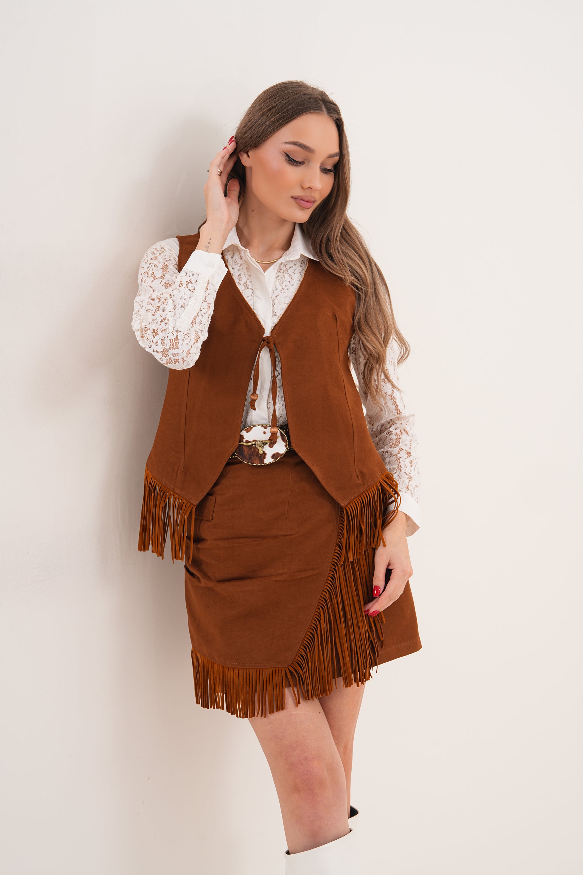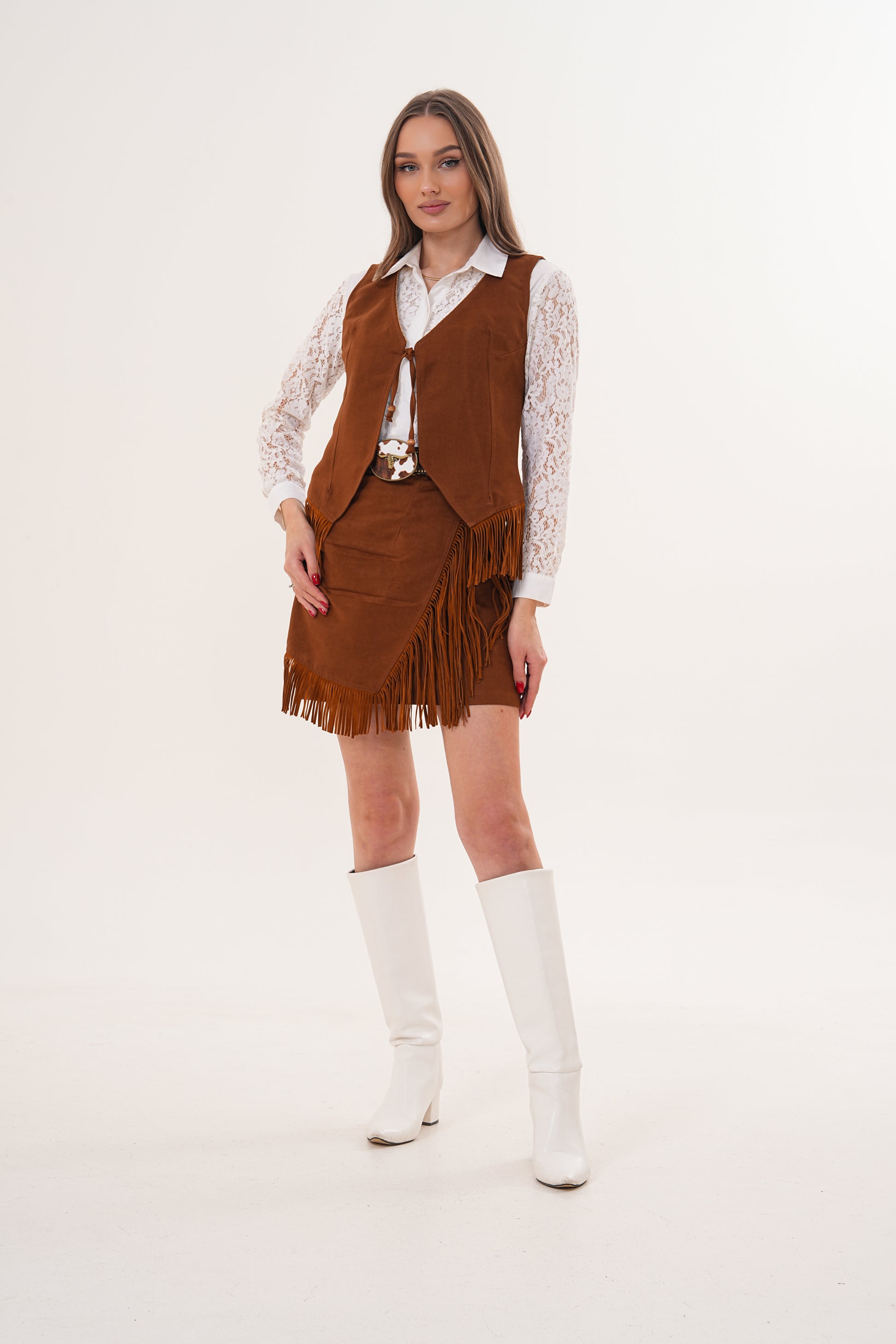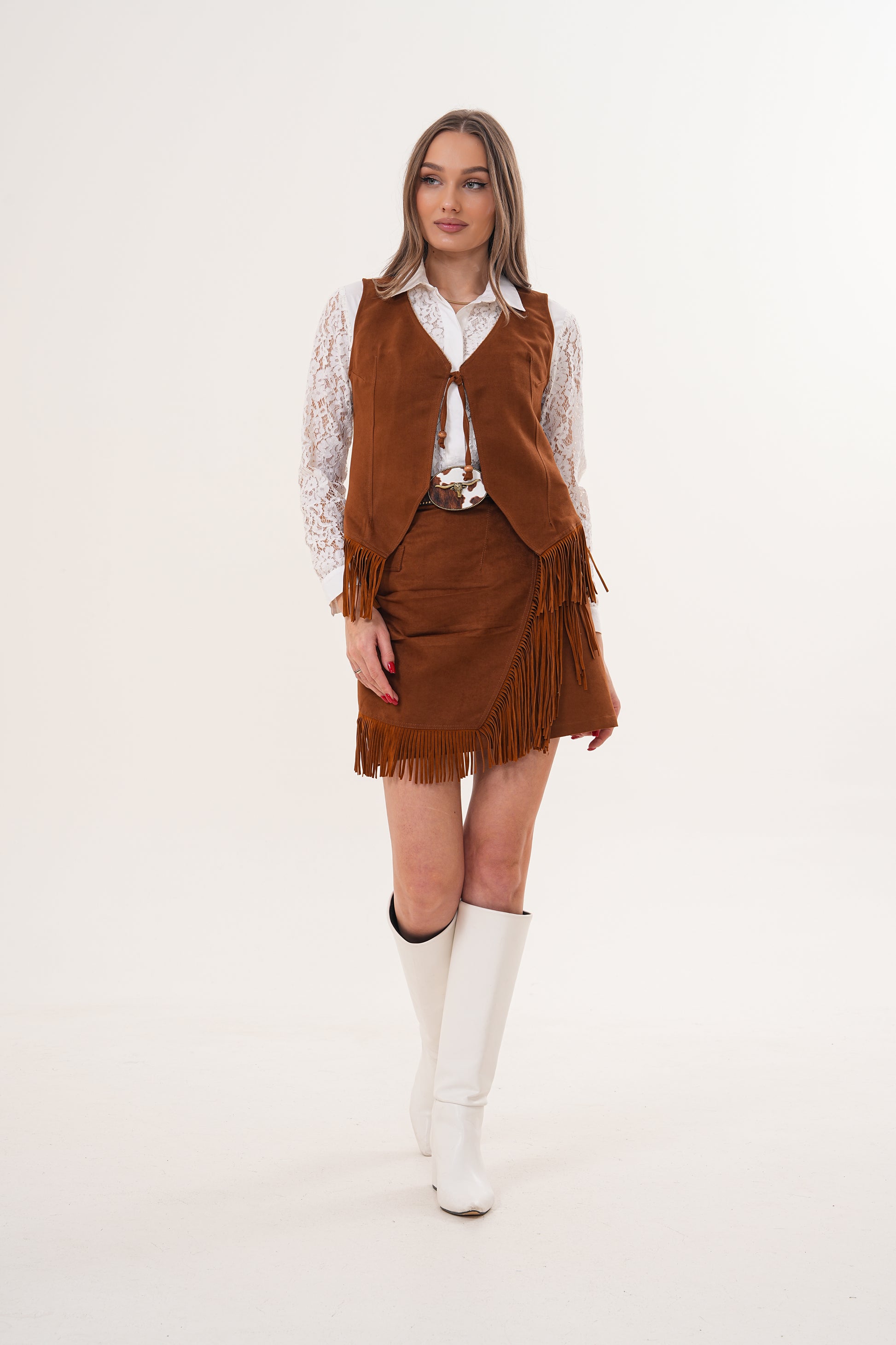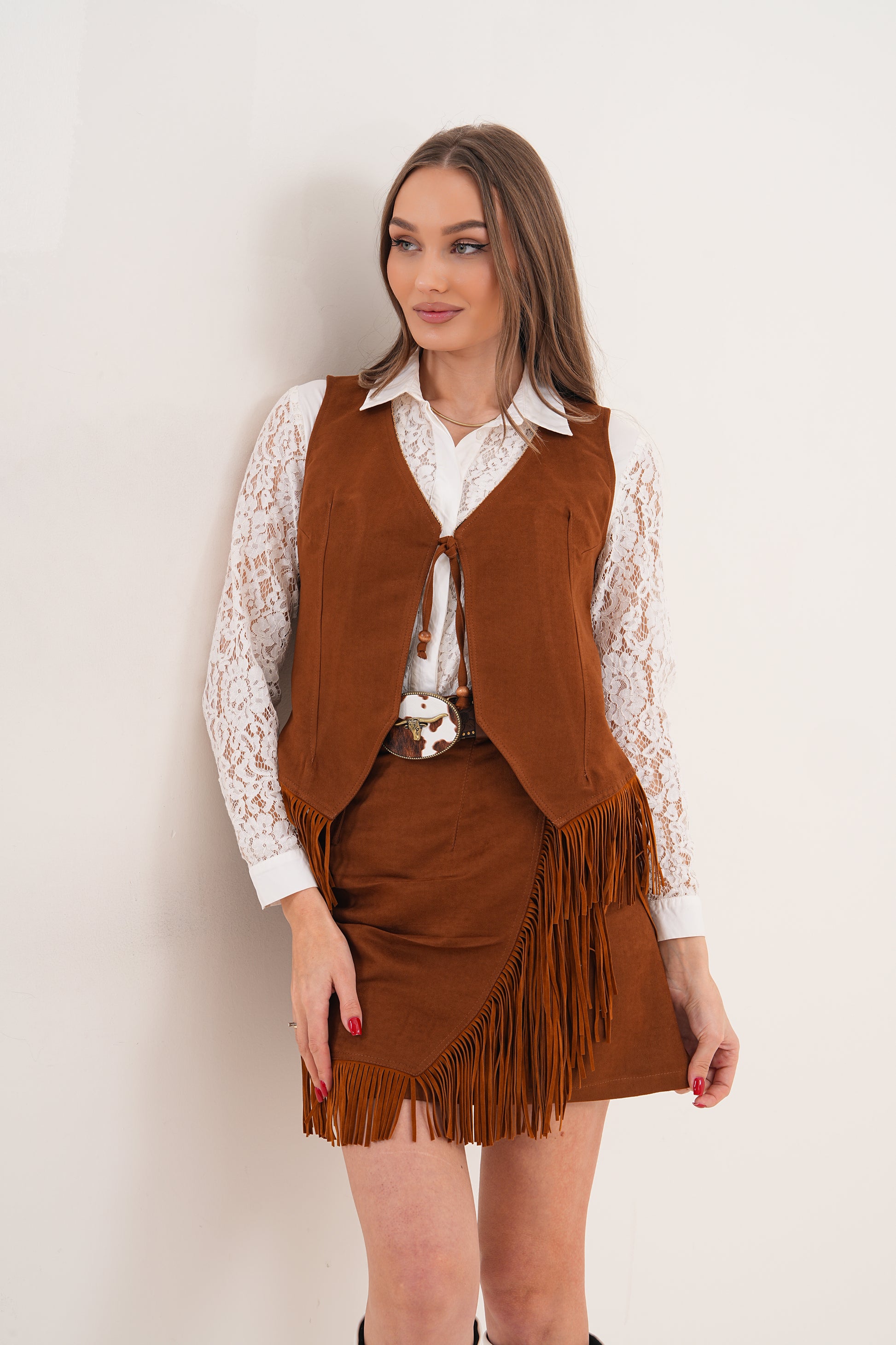 Süet dokunun sıcak tonu, hareketli püskül detayları ve feminen kesimiyle bu takım, girdiğin her ortamda stilini konuşturmanı sağlar.