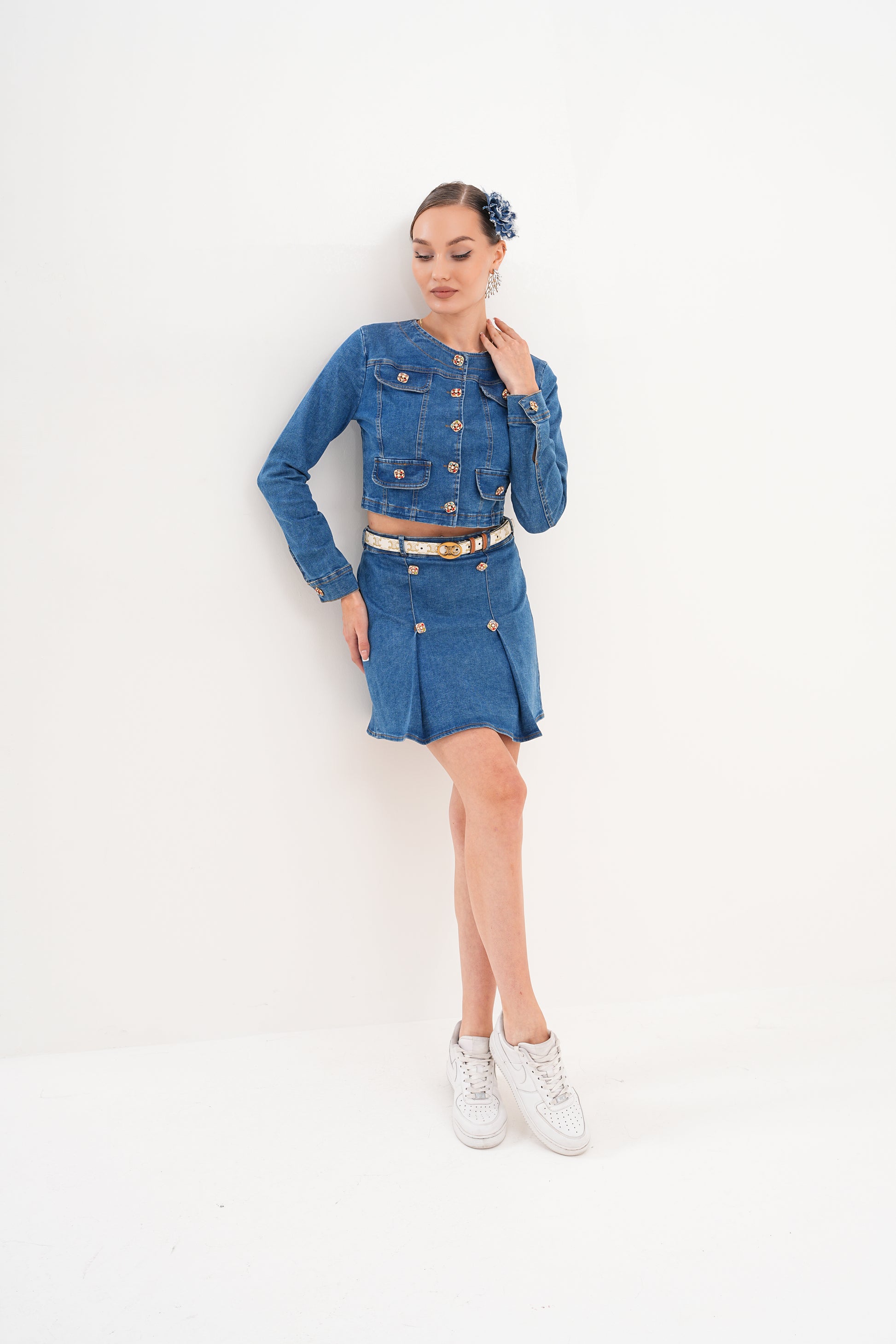 Stilinizi ve kişiliğinizi yansıtan bu özel tasarıma sahip olmak için daha fazla beklemeyin! Moda tutkunları için tasarlanmış olan Denim Olivya Etek ve Ceket, yalnızca sınırlı stoklarla sunuluyor. Hayal ettiğiniz şıklığı yakalayın, hemen satın alın!